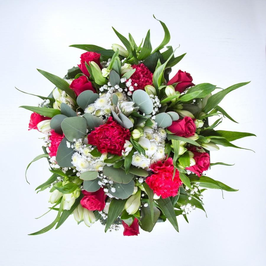 Presenting our Striking Artisan Bouquet—a perfect blend of color, elegance, and artistry. This stunning arrangement features deep red roses, soft carnations, luminous mini white chrysanthemums, and airy gypsophila, all interwoven with tender white alstroemeria and lush aspidistra leaves. The combination creates a truly unique design that captivates the eye and soothes the soul.
