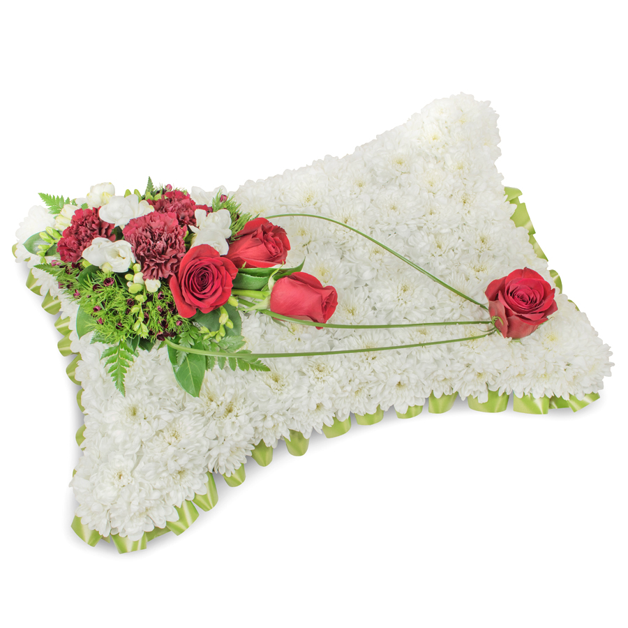 Express your heartfelt sympathies with our beautifully crafted bouquet, featuring white chrysanthemums, red roses, white freesias, dark red carnations, dianthus, and bear grass. This elegant arrangement is perfect for conveying your deepest condolences.